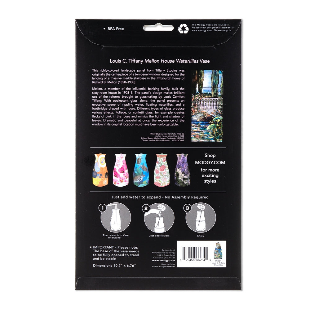 Modgy's Louis C. Tiffany Mellon House Waterlilies expandable, plastic, flower vase offers a delightful way to elevate any decor with vibrant colors and eye-catching patterns. Designed for convenience, these reusable vases pop up effortlessly when needed and fold flat for compact storage, allowing you to rotate between a variety of styles for any occasion. Whether it's a cozy dinner party or a festive gathering, Modgy vases add a touch of artistic flair while providing practicality and versatility to suit your decorating needs.
