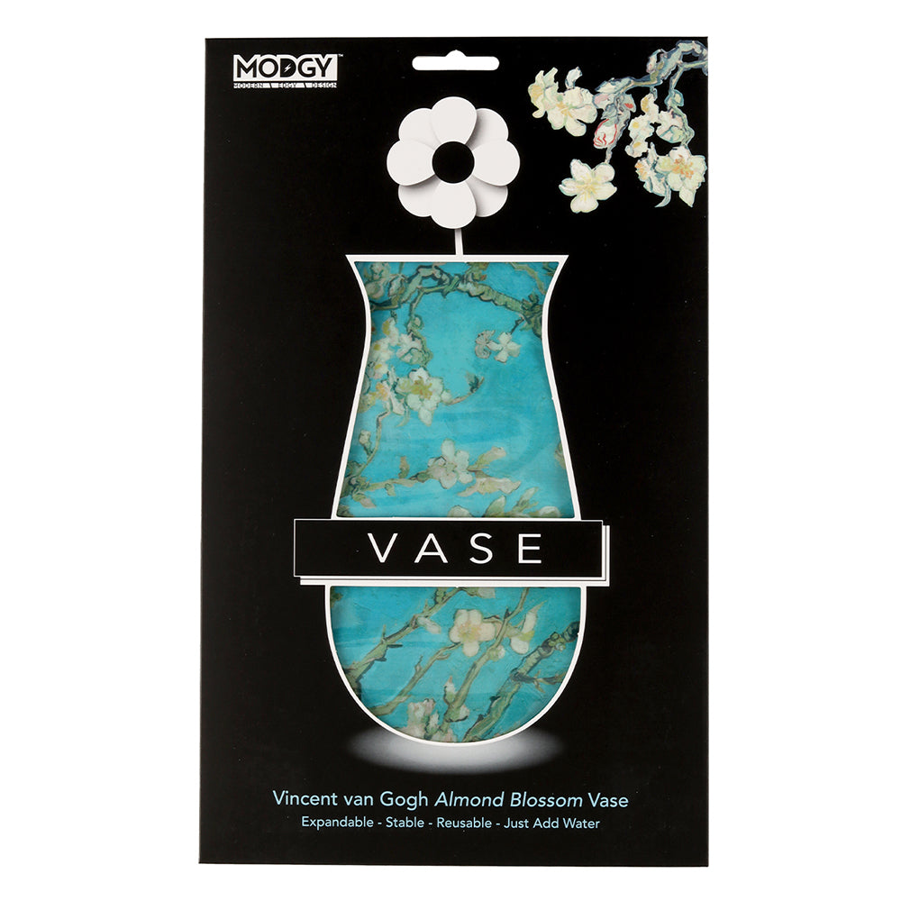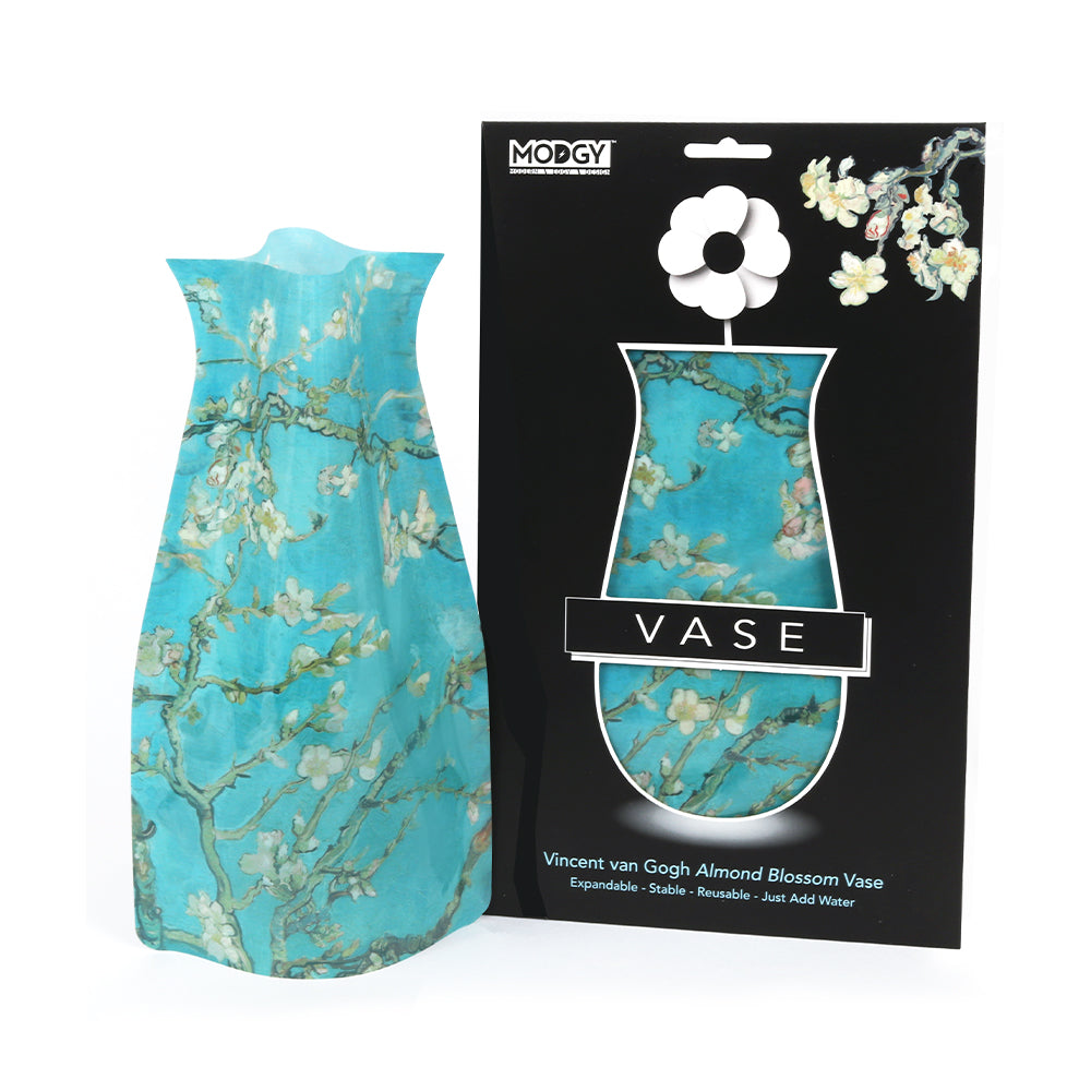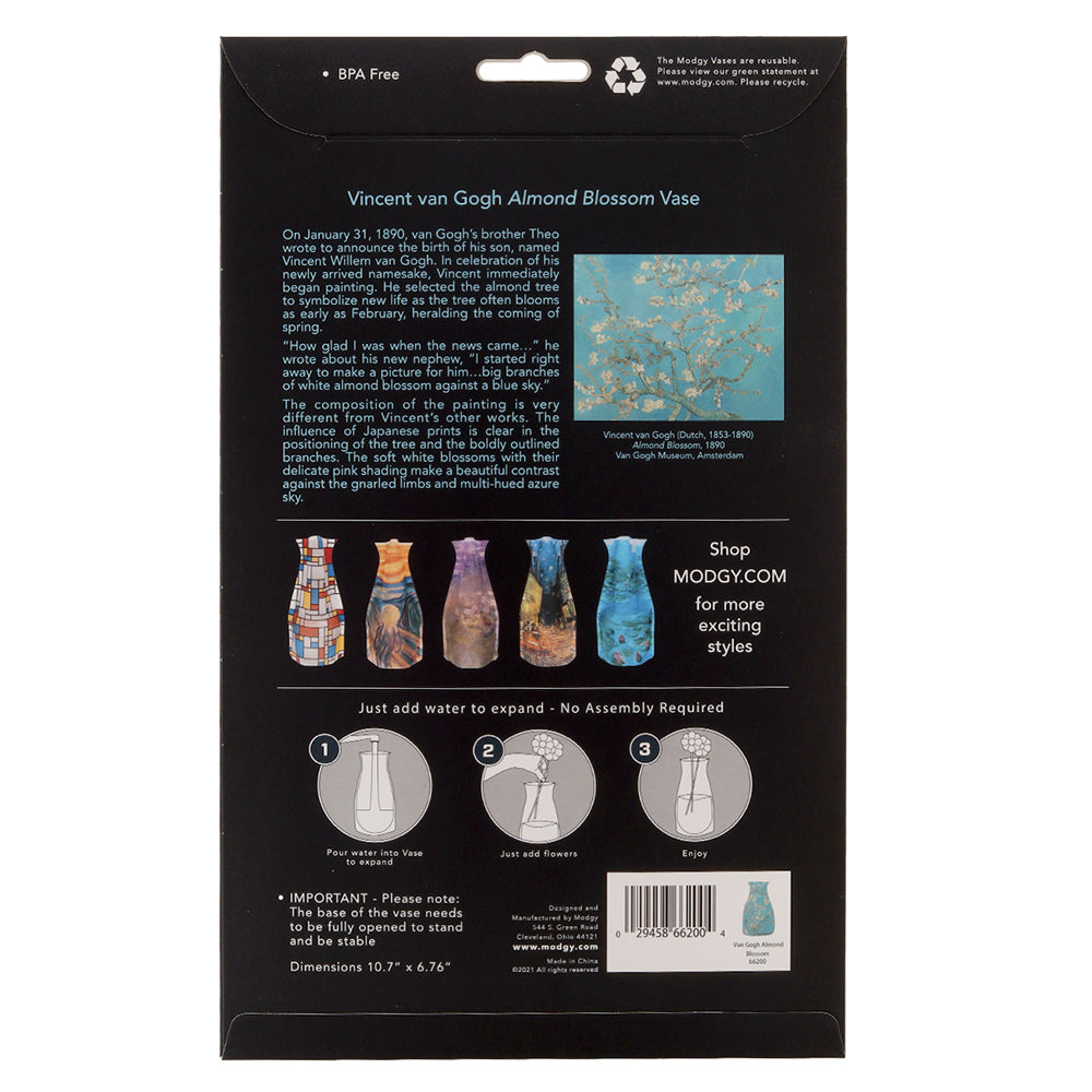Modgy's Vincent Van Gogh Almond Blossom expandable, plastic, flower vase offers a delightful way to elevate any decor with vibrant colors and eye-catching patterns. Designed for convenience, these reusable vases pop up effortlessly when needed and fold flat for compact storage, allowing you to rotate between a variety of styles for any occasion. Whether it's a cozy dinner party or a festive gathering, Modgy vases add a touch of artistic flair while providing practicality and versatility to suit your decorating needs.
