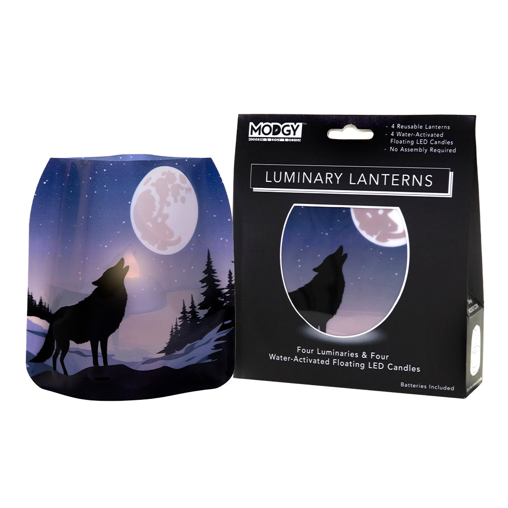 MODGY Howlin' Luminaries seamlessly blend timeless artistry with modern illumination, each pack including four lanterns and four water-activated LED candles, batteries included. Setting the mood with soft lighting and eye-catching designs, these collapsible wonders enhance every moment. Modgy luminaries offer functionality and elegance perfect for any occasion, from large events to tranquil evenings.