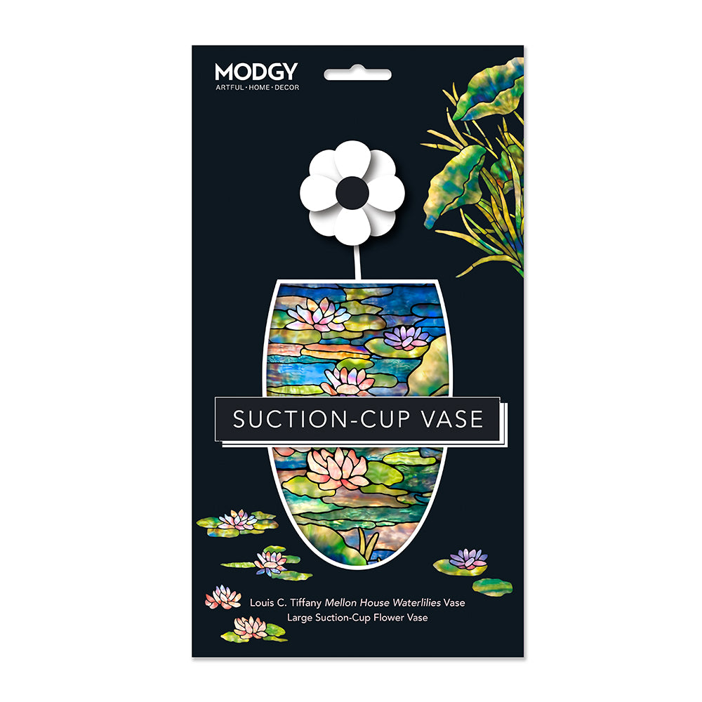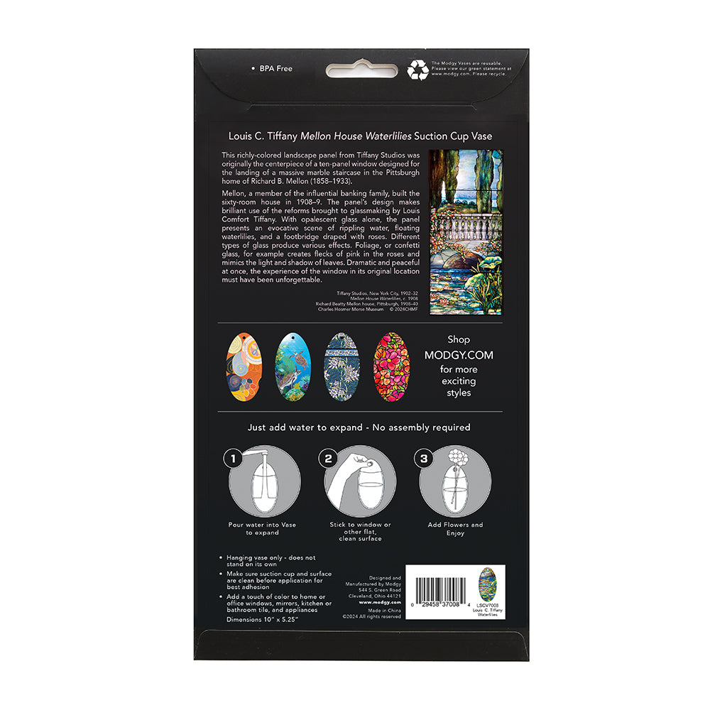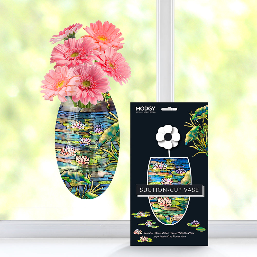 The Modgy Louis C. Tiffany Mellon House Waterlilies Large Suction Cup Vase is a stylish, expandable vase that attaches securely to smooth surfaces like windows and mirrors with a strong suction cup. Made from durable, BPA-free plastic, it’s easy to fill with water and a few flowers, then collapses flat for storage. Available in vibrant designs, it adds a colorful, elegant touch to any space, perfect for creative and modern floral displays.