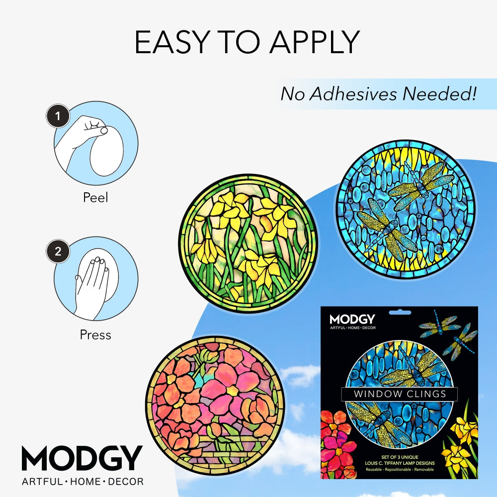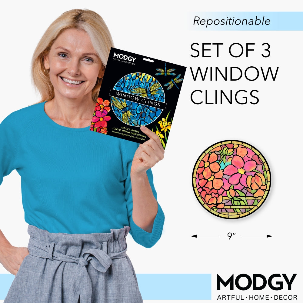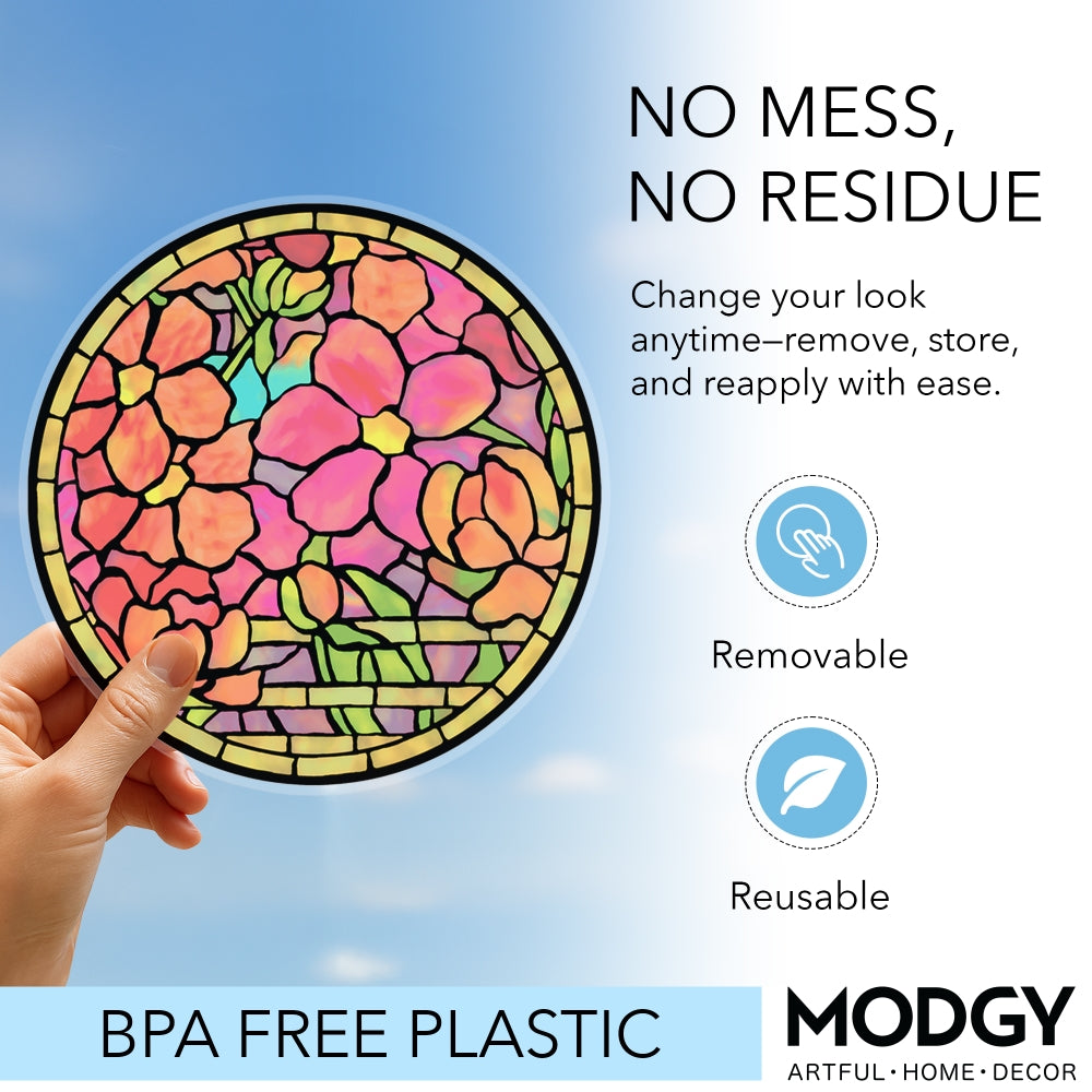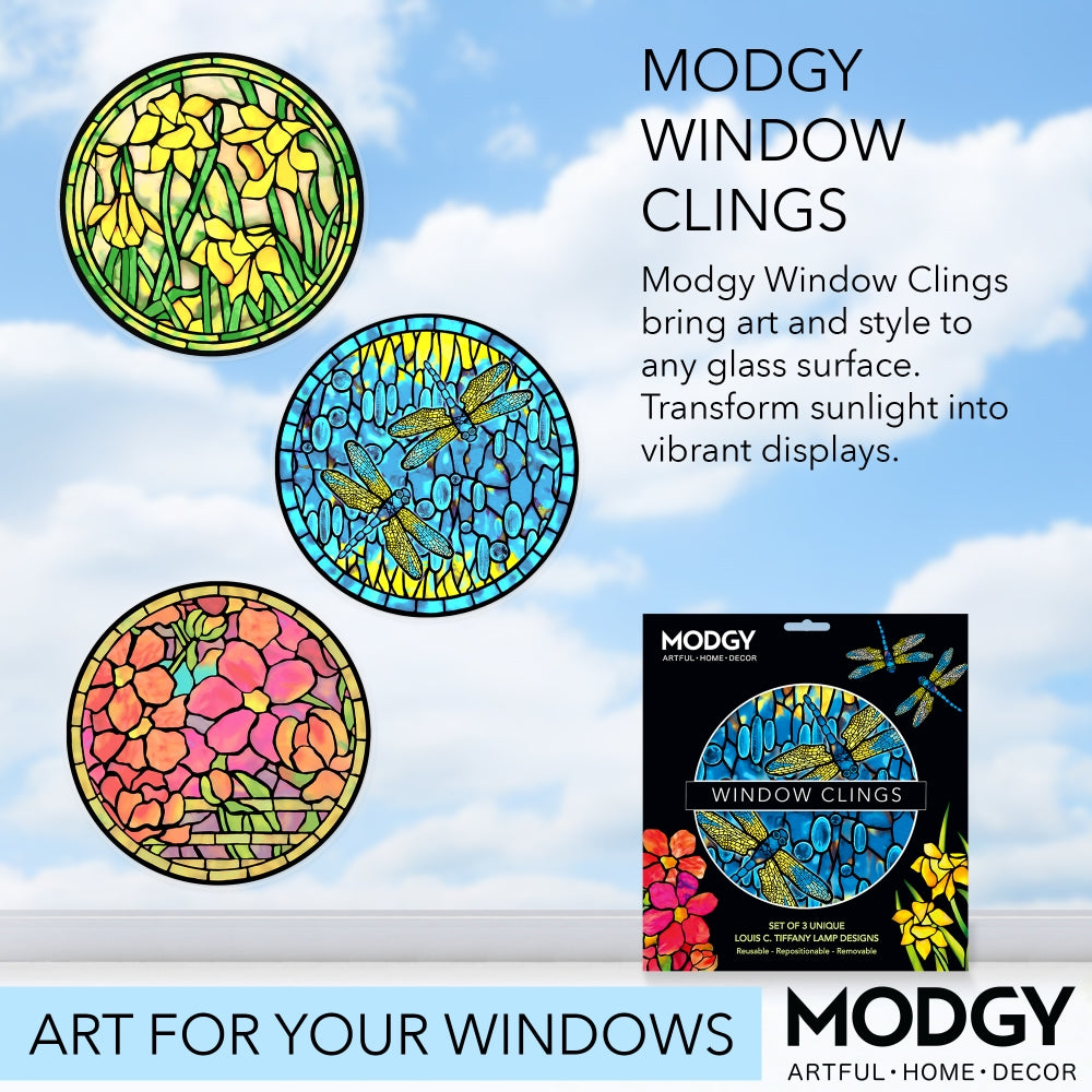 Modgy Window Clings bring art and style to your windows with vibrant, repositionable designs that transform sunlight into colorful displays. Each pack includes three unique designs, perfect for mixing, matching, or spreading throughout your space. Easy to apply—just peel and press—they cling without adhesives and leave no residue. Reusable and removable, they’re ideal for adding privacy, personality, and a pop of color to any glass surface at home, in the office, or in the classroom.